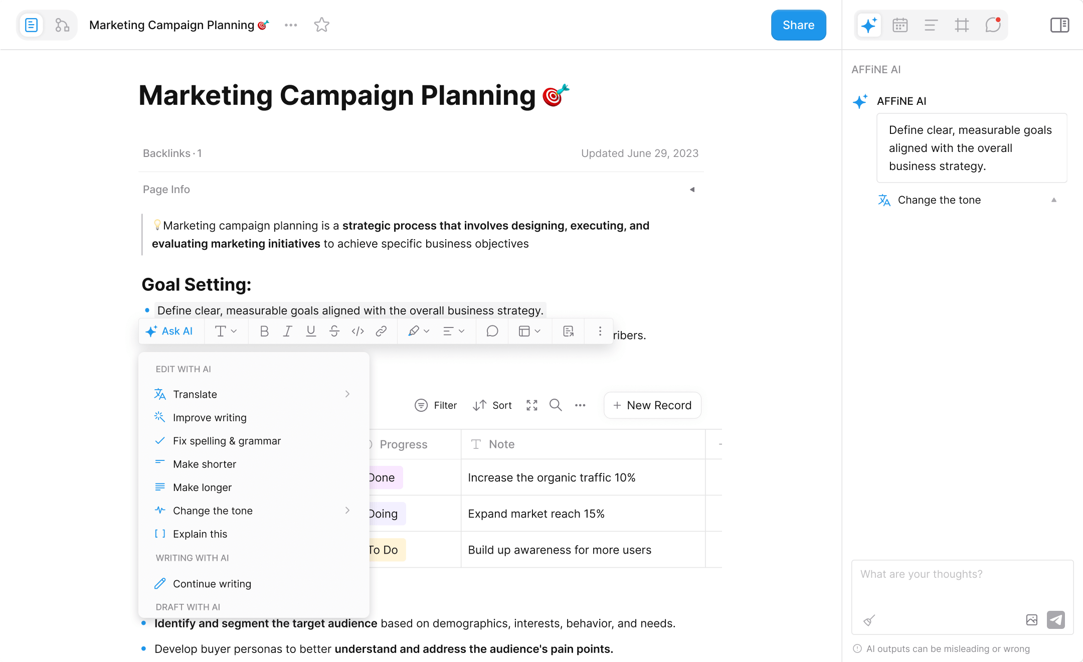 In a Doc's Page Mode, you can select one or more blocks, or select the text content, and click "Ask AI" in the pop-up Format Toolbar to activate AFFiNE AI.
